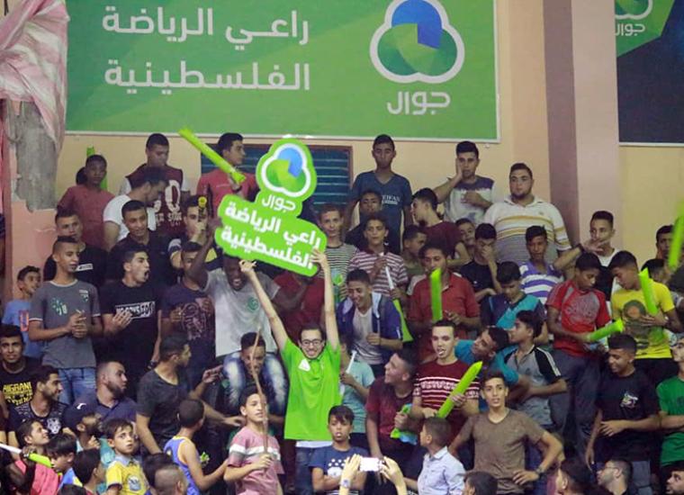 ورفعت الجماهير لافتات شركة جوال الراعي الحصري لبطولة الدوري الممتاز التي ينظمها الاتحاد الفلسطيني لكرة السلة وتسير بنجاح منقطع النظير.
