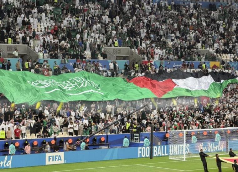 في مشهد يختصر عمق العلاقة بين الشعبين الفلسطيني والسعودي، شهدت مدرجات ملعب المباراة قبل انطلاق مواجهة ربع نهائي كأس العرب بين المنتخبين الفلسطيني والسعودي، قيام جماهير "الأخضر" برفع علم فلسطين عالياً، في رسالة واضحة تؤكد وحدة الروح العربية والدعم اللامحدود للفدائي.